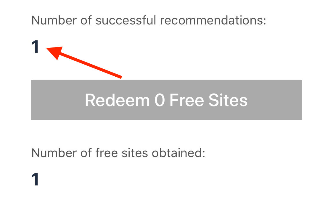 When you get enough recommendations, you can click the “Redeem” button to redeem the corresponding number of free sites.