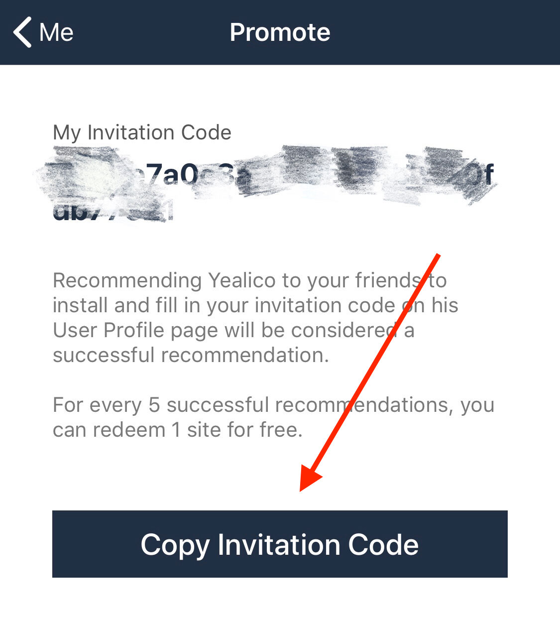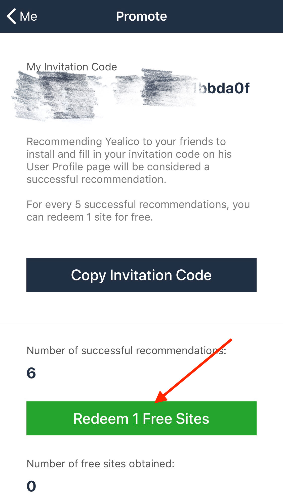 Recommending Yealico to your friends to install and fill in your invitation code on his User Profile page will be considered a successful recommendation. For every 5(variable) successful recommendations, you can redeem 1 site for free.